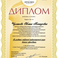 09 ноября 2018 г. в Общественной палате России состоялась торжественная церемония награждения победителей конкурса преподавателей вузов «Золотые Имена Высшей Школы», где Оксана Чуланова, доктор экономических наук, доцент, профессор кафедры «Государственное и муниципальное управление и управление персоналом» СурГУ, стала победителем в номинации «За развитие открытой информационной среды высшего образования».