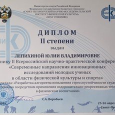 Второе место за доклад «Разработка алгоритма повышения стрессоустойчивости студентов-первокурсников посредством применения оздоровительно-рекреативных технологий в физическом воспитании» заняла аспирант первого года обучения по специальности «физическая культура и профессиональная физическая подготовка» Юлия Лепихина.