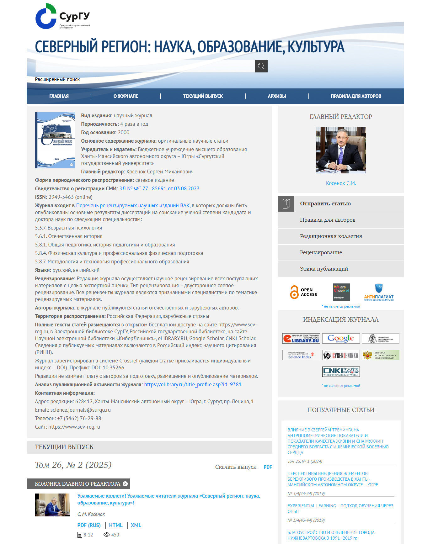 Редакционная коллегия журнала – это команда признанных ученых, теоретиков и практиков, среди которых кандидаты и доктора наук, ведущие преподаватели, эксперты в своей области, академики и члены-корреспонденты Российской академии наук. Возглавляет редколлегию ректор Сургутского государственного университета, доктор педагогических наук, профессор Сергей Михайлович Косенок, круг его научных интересов включает такие стратегически важные вопросы, как регионализация образования, внедрение инноваций, развитие проектного управления, создание ресурсных центров в вузе. Особое внимание в научном дискурсе уделяется перспективам развития регионального и непрерывного образования, новых форматов дистанционного и смешанного обучения, которые становятся условием для устойчивого интеллектуального развития региона. Важное место в его научной деятельности – исследования, посвященные вопросам образования, сохранения и развития культурной идентичности коренных малочисленных народов Югры. Сергей Михайлович занимается поиском эффективных моделей интеграции традиционного опыта, этнокультурных особенностей коренных народов в современные образовательные практики региона.