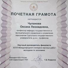 В рамках съезда за подготовку студента – финалиста XXVII Международного конкурса научных работ молодежи по экономике c исследованием на тему «Разработка инструментов применения бионического подхода в развитии талантов организации», награжденного дипломом в специальной номинации «За вклад в разработку социально значимого регионального проекта», профессор Оксана Чуланова была отмечена Почетной грамотой Вольного экономического общества (исследование выполнено за счет гранта Российского научного фонда, проект № 25-28-20474).