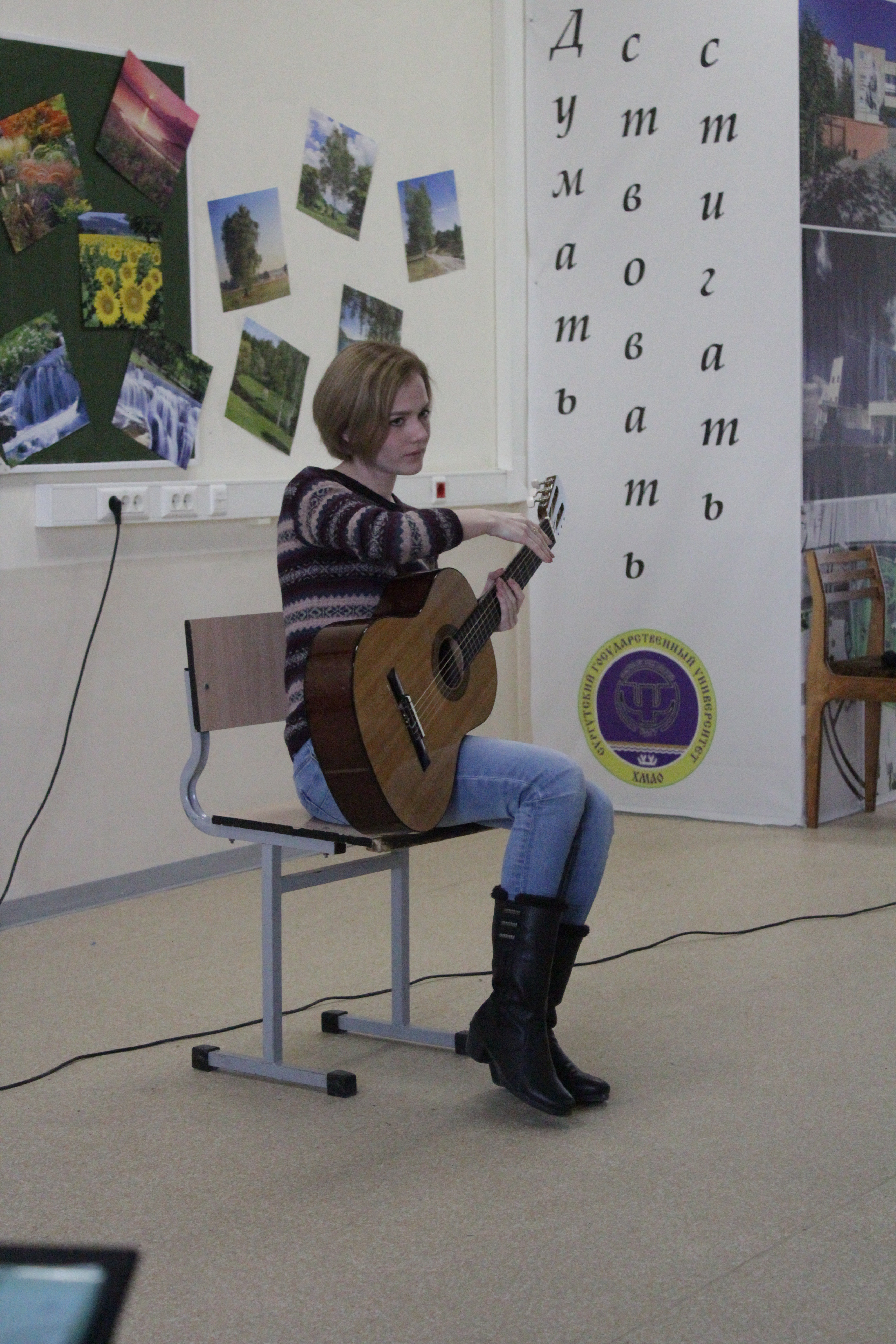 Но есть еще одна сила, способная противостоять войне, смерти и разрушению. Об этом твердо знают Яна Яковлева и Роман Безродний, которые песней «Эхо любви» открыли новую тему — центральную в литературе всех времен и нашего литературного вечера. «Заметался пожар голубой» Юлия Степина (С. Есенин) и «Обидная любовь» Хамис Гаджиахмедова (Э. Асадова), «Встретился мне в жизни ветреный мальчишка» Тахмина Мирзоева — все эти слова нашли отклик в сердцах и студентов, и преподавателей настолько, что взгрустнулось всем, и тогда решено было петь. «Я люблю тебя, это здорово» пела под гитару Полина Сидорова и «Спасибо, жизнь» — Яна Яковлева.