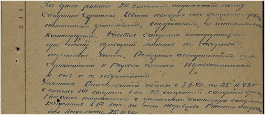 «К сожалению, у нас нет свидетельств, переписки с фронта, поэтому невозможно точно проследить судьбу солдата-сержанта Иванова Фёдора Фёдоровича вплоть до ноября 1942 года. А потому начнем с официальных документов о награждении его боевой наградой, медалью «За боевые заслуги», которой он был отмечен в самый первый день начала печально известной Ржевско-Сычёвской операции «Марс» (25.11. – 20.12.1942 г.) Западного фронта (командующий генерал-полковник И.С. Конев). Эта операция является второй попыткой отодвинуть немцев от Москвы, окружить 9-ю армию Моделя, ликвидировать Ржевский выступ. Отцу уже 34 года. Он командир саперного отделения в 141-м саперном батальоне 33-й отдельной саперной бригады в 20-й армии. Награждён за умелые и своевременные действия подразделения в бою, который начался в 9:20 утра 25 ноября, где и был легко ранен у села Жеребцово, что недалеко от старинного села Хлепень, но поле боя не покинул», – с особой грустью и в то же время с гордостью продолжает рассказ об отце ученый Сургутского госуниверситета.