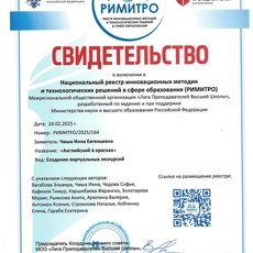 Проект «Английский в красках» также получил свидетельство о включении в Национальный реестр инновационных метод и технологических решений в сфере образования (РИМИТРО) Межрегиональной общественной организации «Лига преподавателей высшей школы», разработанной по заданию и поддержке Министерства науки и высшего образования Российской Федерации (Рег. номер РИМИТРО/2025/164 от 24.02.2025 г., вид – создание виртуальных экскурсий).