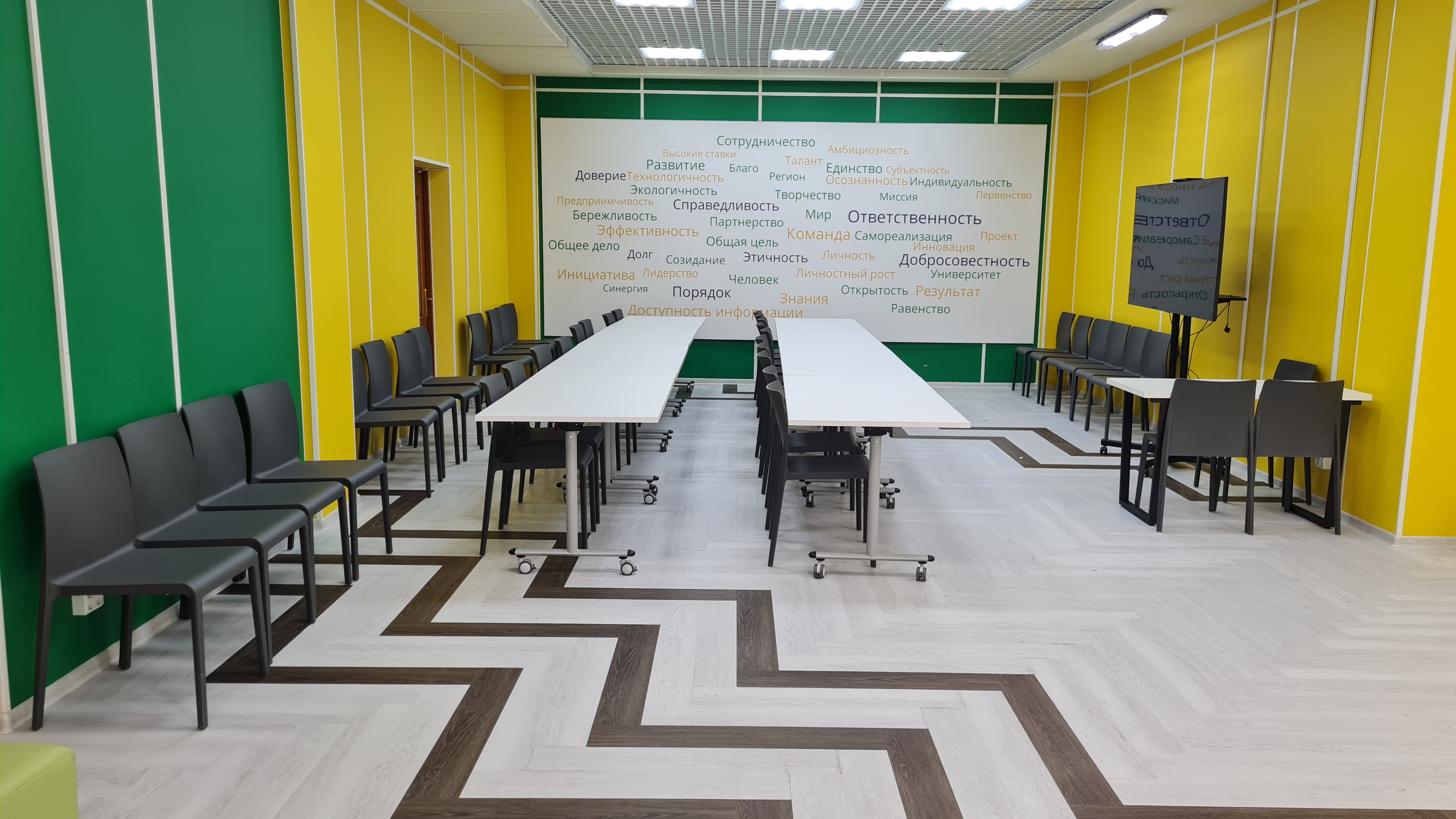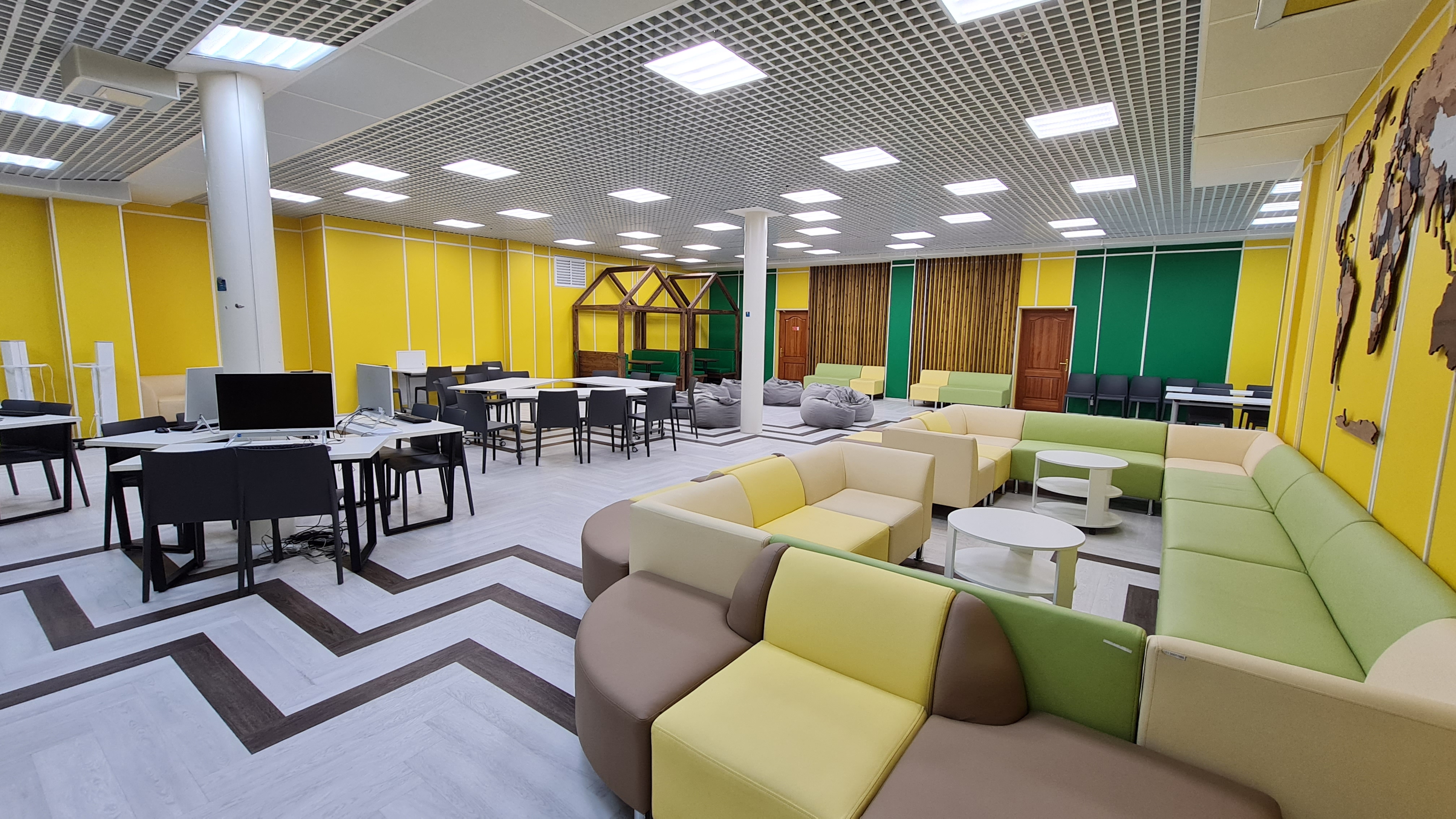 70-80 посадочных мест, 9 компьютеров, телевизор, возможность работать на ноутбуках. Столы трансформируются. Возможность работы небольшими группами в различных зонах.